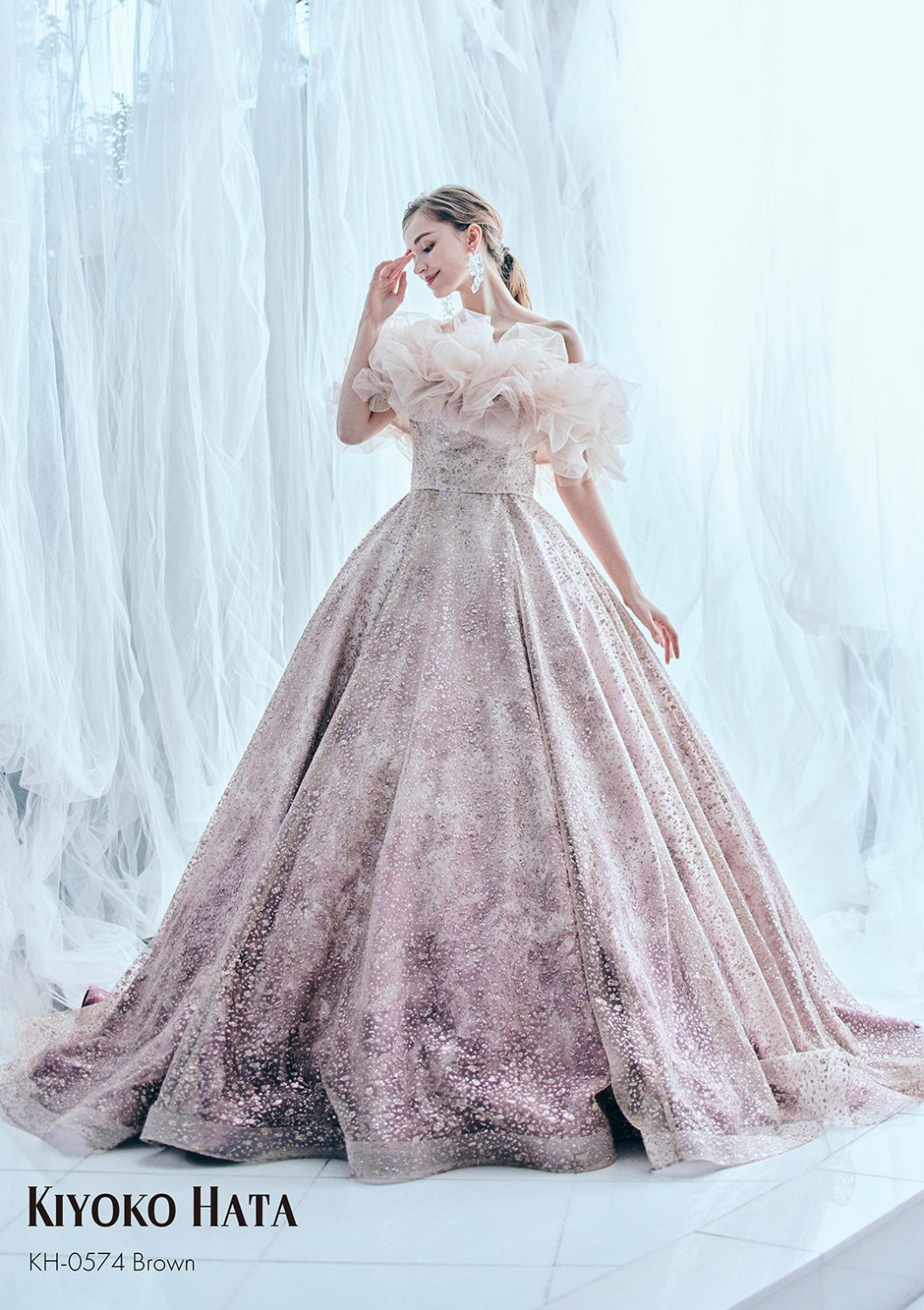 光を吸い込むように煌めく、宝石のような輝きと繊細な柄が全身に施されたジュエリードレス。濃淡のブラウンが美しいグラデーションを描き、その上に輝くグリッターチュールが贅沢に重なり、主役感溢れる華やかさを演出します。華やかなオフショルダーは、写真映えも抜群で、ゲストの視線を一身に集める一着。